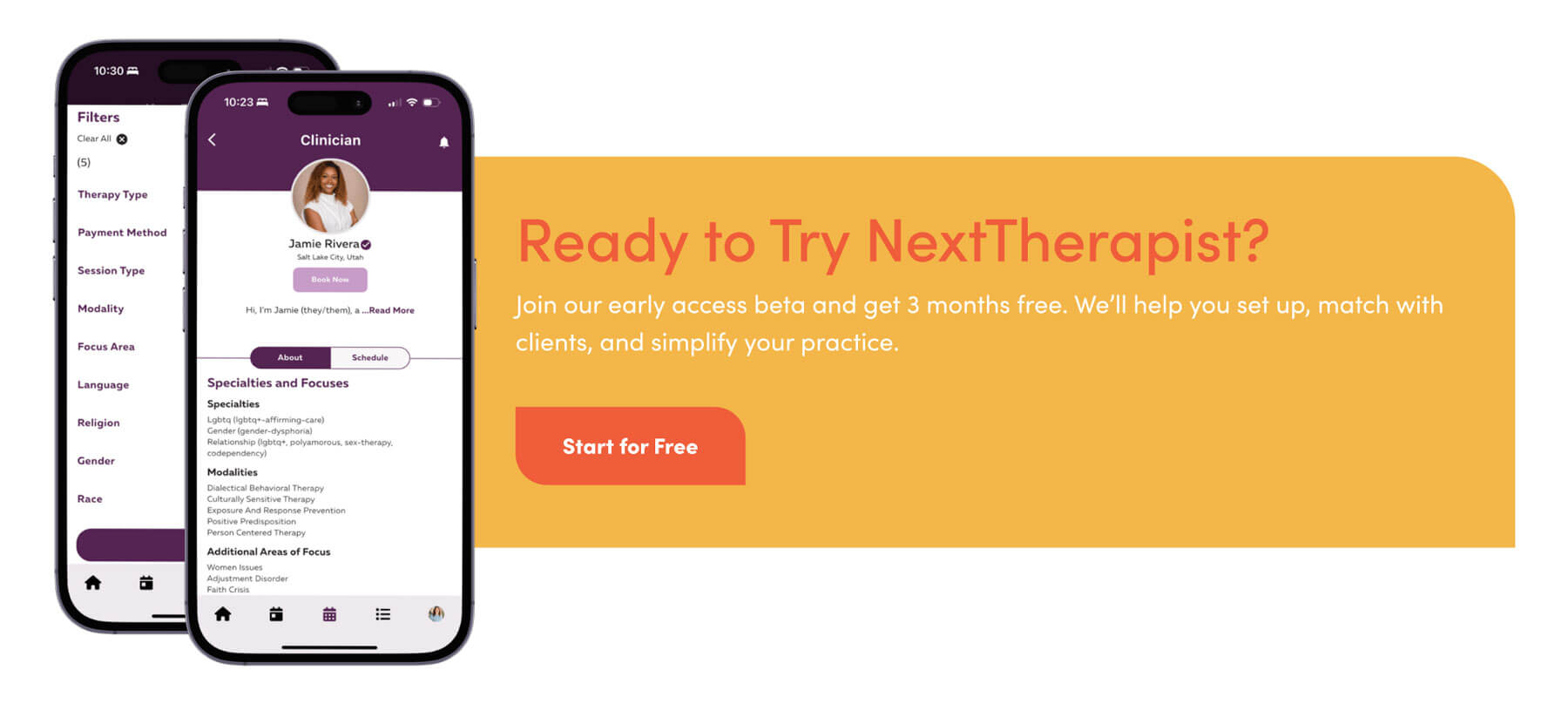 Our platform helps clients find therapists based on real alignment—not just availability or a list of vague specialties. We encourage therapists to narrow their focus and identify their true areas of expertise, rather than listing every possible condition they’ve encountered. This helps clients find someone who’s not just available—but actually qualified.
