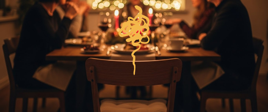 “Trapped in tradition” really stayed with me. It captures how many of us feel when we’re pulled back into old family systems. The same shows playing in the background. The same food no one actually enjoys. The same passive-aggressive comments. The same family members who don’t show up. The same ones who stay too long. The one family member who insists on hugging you every year—even though it makes you deeply uncomfortable.